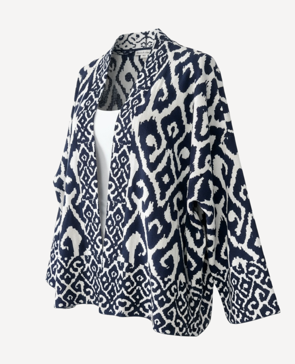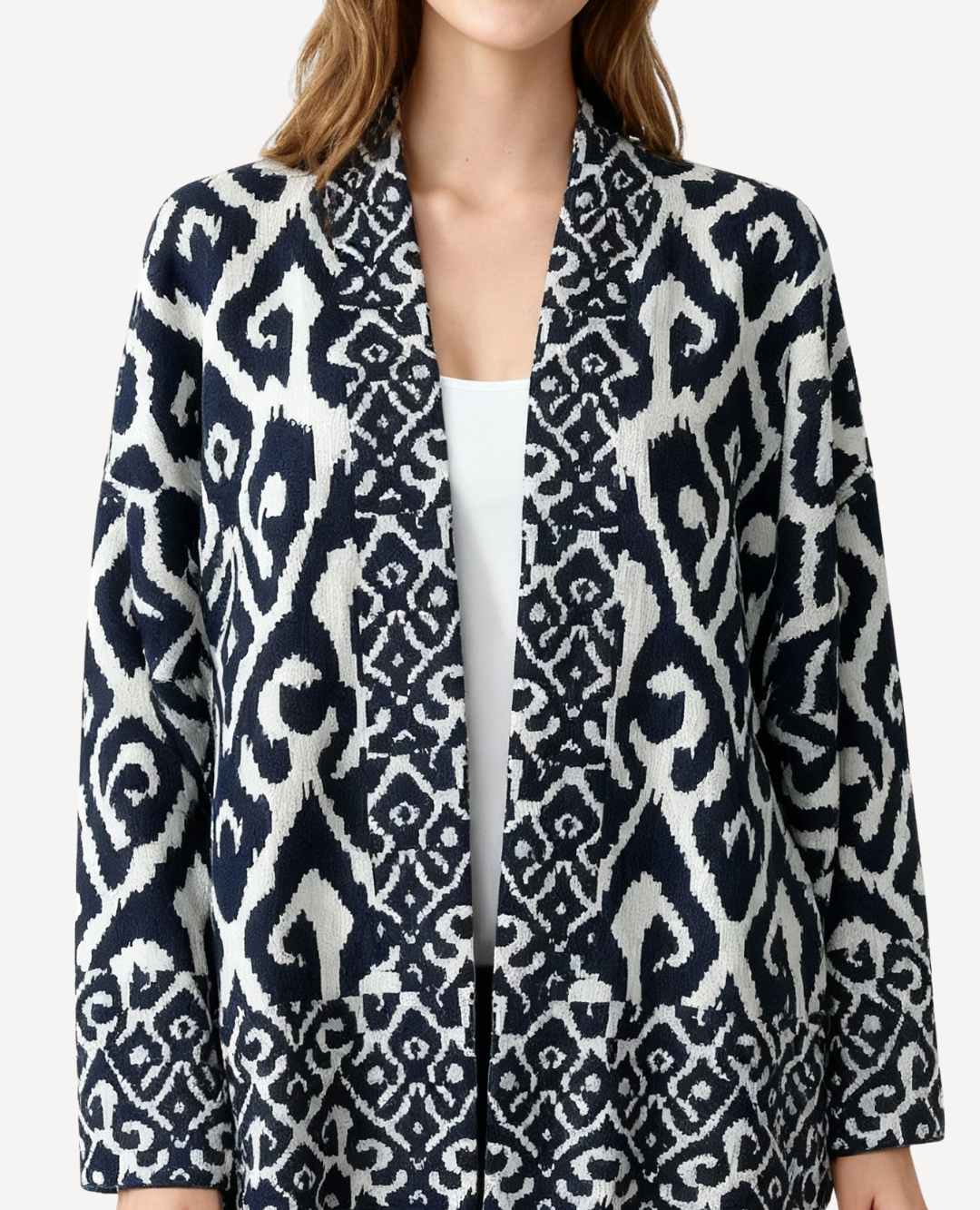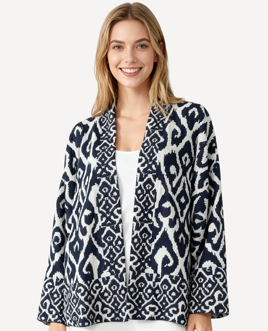 Una pieza sofisticada y artística que roba miradas. Su diseño fluido y ligero en tonos azul y blanco se adorna con elegantes arabescos que evocan estilo mediterráneo y frescura. Perfecta para elevar cualquier look, ya sea sobre un outfit monocromático, un pantalón blanco de lino, o incluso unos jeans clásicos para un toque más casual. Ideal para quienes aman las prendas con personalidad y movimiento. 🌊✨