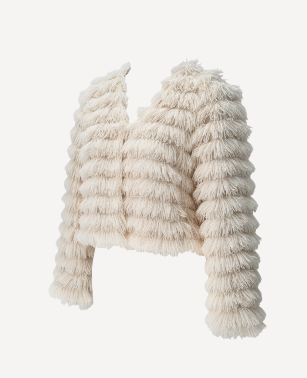 Una prenda suave, elegante y llena de estilo que combina calidez y glamour. Su textura esponjosa tipo peluche aporta volumen y un aire sofisticado, perfecta para destacar en los días fríos sin perder ese toque chic.