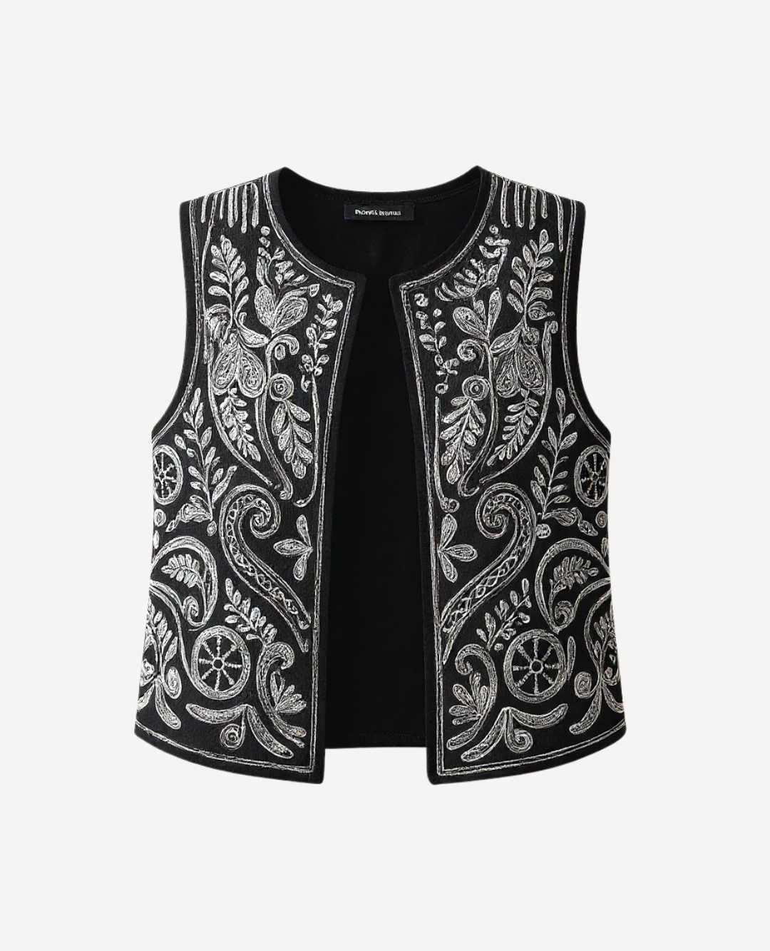 Chaleco en gamuza bordado – color negro 🖤✨. Una pieza elegante y artesanal que combina la suavidad de la gamuza con un bordado en hilo beige lleno de detalles y estilo.