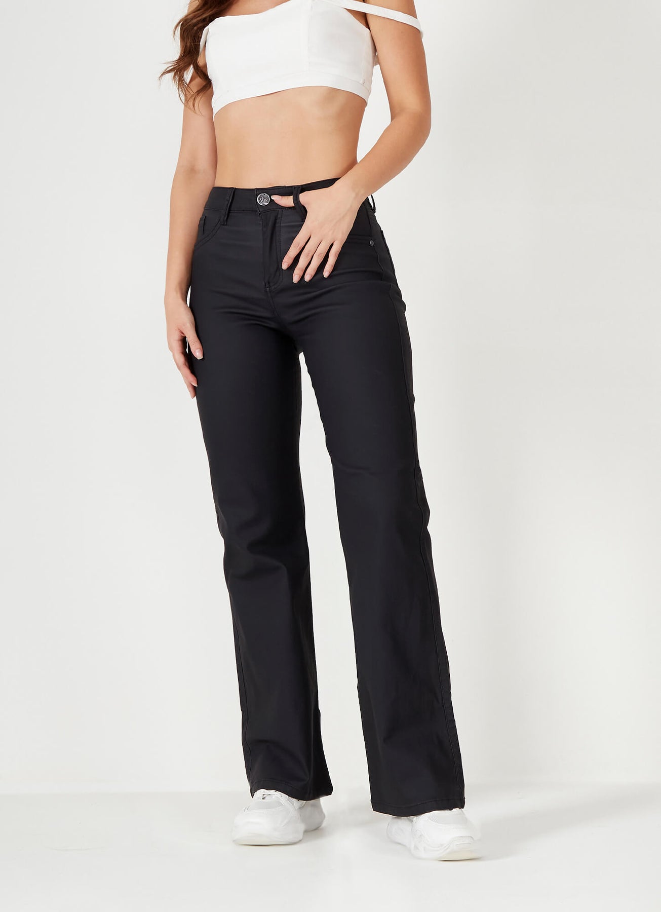 Un jean negro tipo cuerina es una prenda moderna, ideal para quienes buscan un look edgy y sofisticado a la vez. Este tipo de jean tiene la estructura de un pantalón vaquero tradicional pero está confeccionado en un material sintético que imita la apariencia del cuero, proporcionando un toque brillante y una textura suave. El efecto visual de la cuerina le da un aire de moda y lujo, a la vez que conserva la comodidad de los jeans. Este estilo se ha convertido en un básico de las tendencias urbanas y de la moda nocturna, pero también puede adaptarse a looks más casuales y sofisticados.
