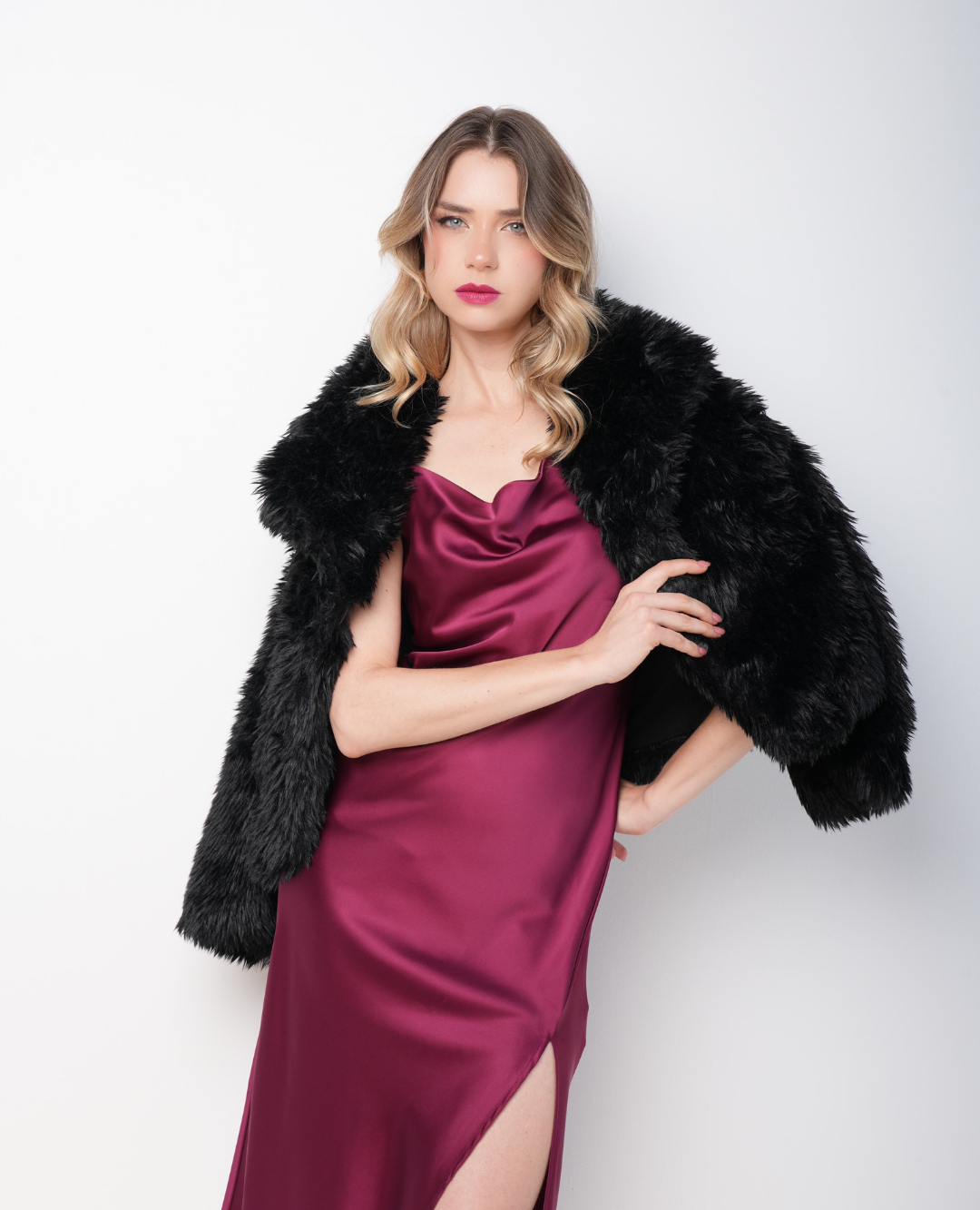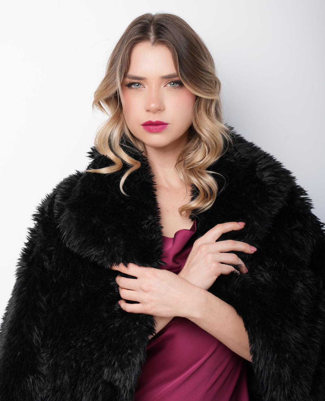 Envuélvete en estilo y comodidad con este abrigo de peluche negro, una prenda suave, abrigada y súper elegante. Su textura esponjosa aporta un look moderno y chic, perfecto para los días fríos sin perder sofisticación.