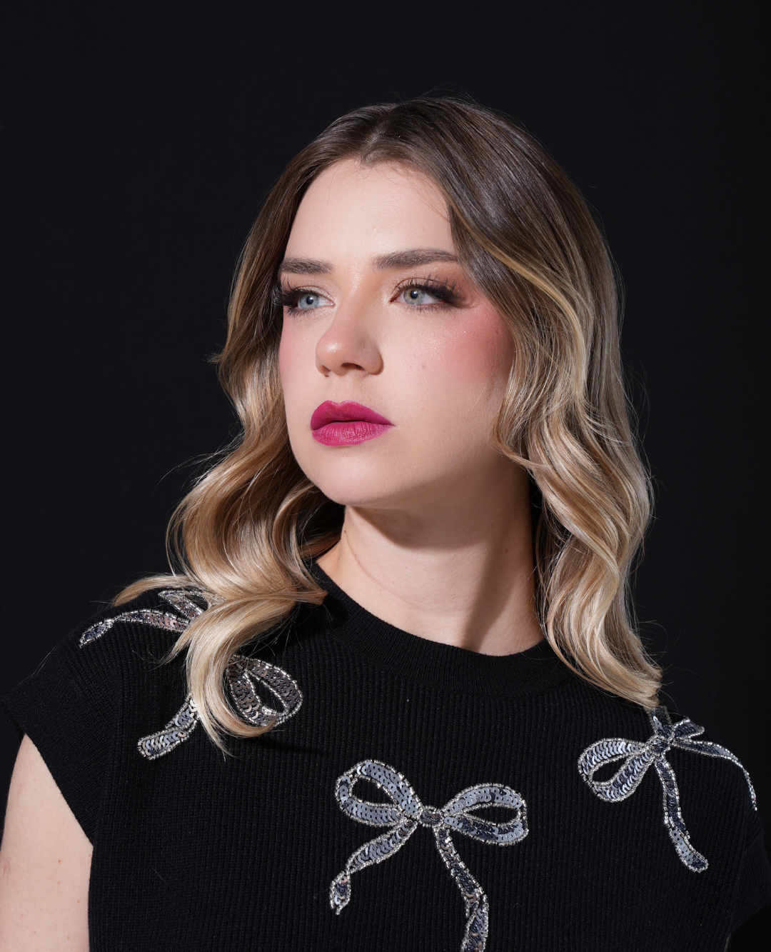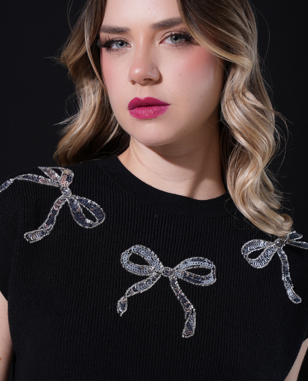 Elegante, moderno y lleno de brillo. Este chaleco negro se destaca por sus moños decorativos en lentejuelas plateadas, que añaden un toque festivo y glamuroso al look. Su diseño estructurado combina a la perfección con camisas básicas o blusas satinadas, ideal para outfits de noche o eventos especiales. Combínalo con pantalones de vestir o una falda elegante para un estilo sofisticado y con mucha personalidad. 🎀💫