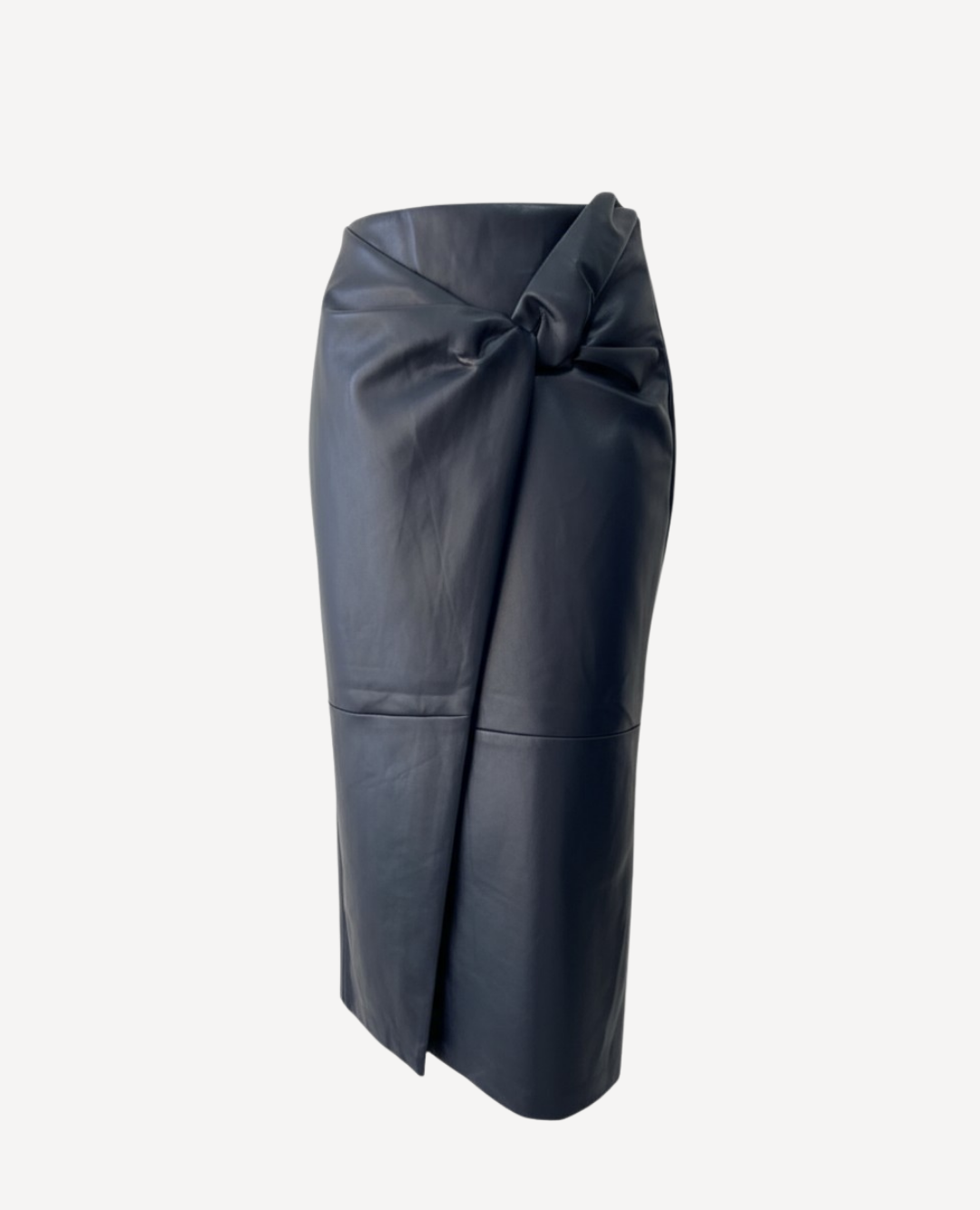 Una prenda de impacto con aire moderno y sofisticado. Esta falda midi en cuero sintético negro se distingue por su detalle de nudo frontal, que realza la silueta y aporta un toque vanguardista. Su corte recto y abertura discreta al frente le brindan movimiento y elegancia.