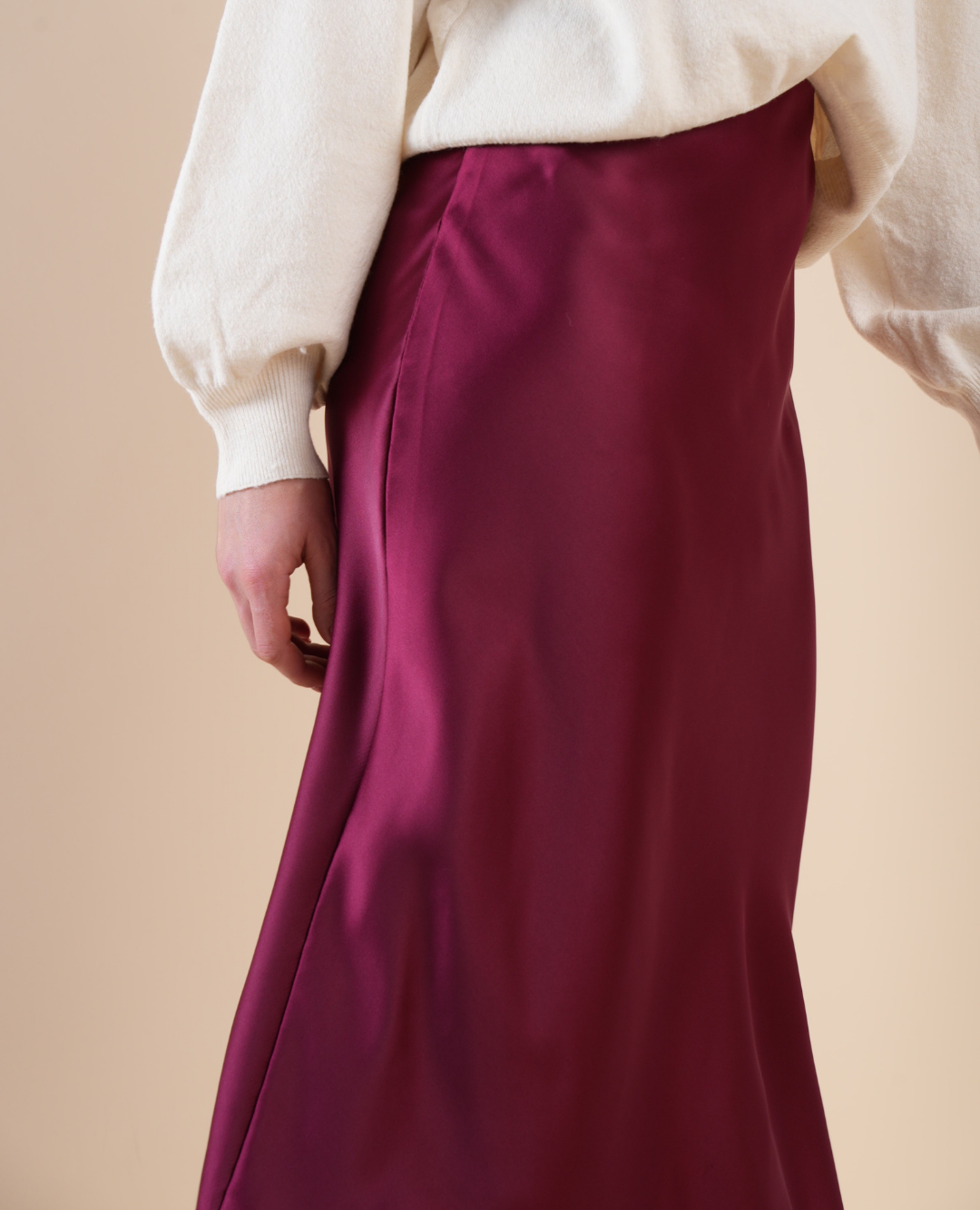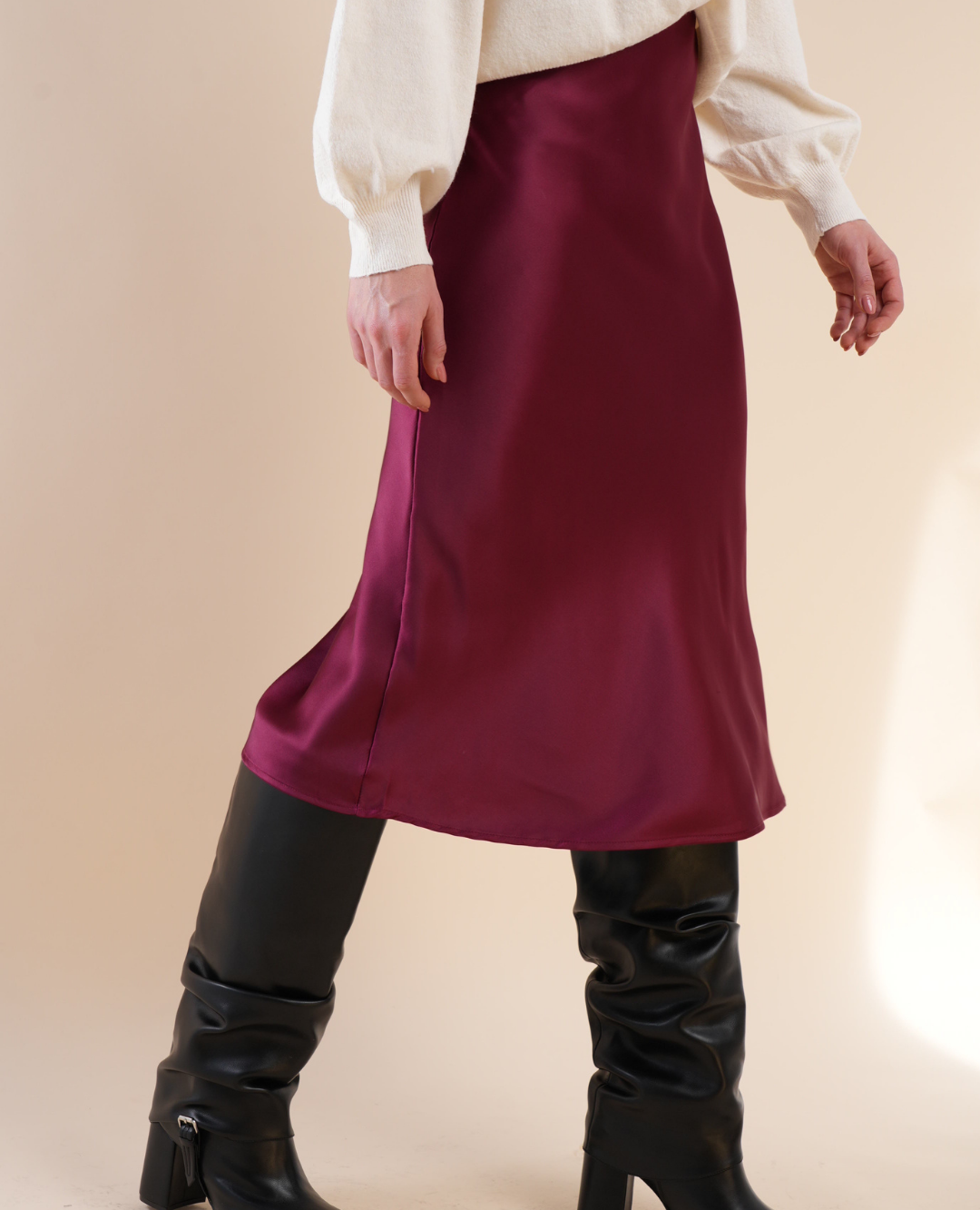 Su tonalidad vino profundo realza la elegancia atemporal, ideal para ocasiones especiales o looks de noche. El corte midi estiliza la silueta y permite un movimiento fluido y ligero al caminar. Una pieza versátil que puede combinarse con blusas satinadas, tops delicados o sacos estructurados para un outfit lleno de distinción.