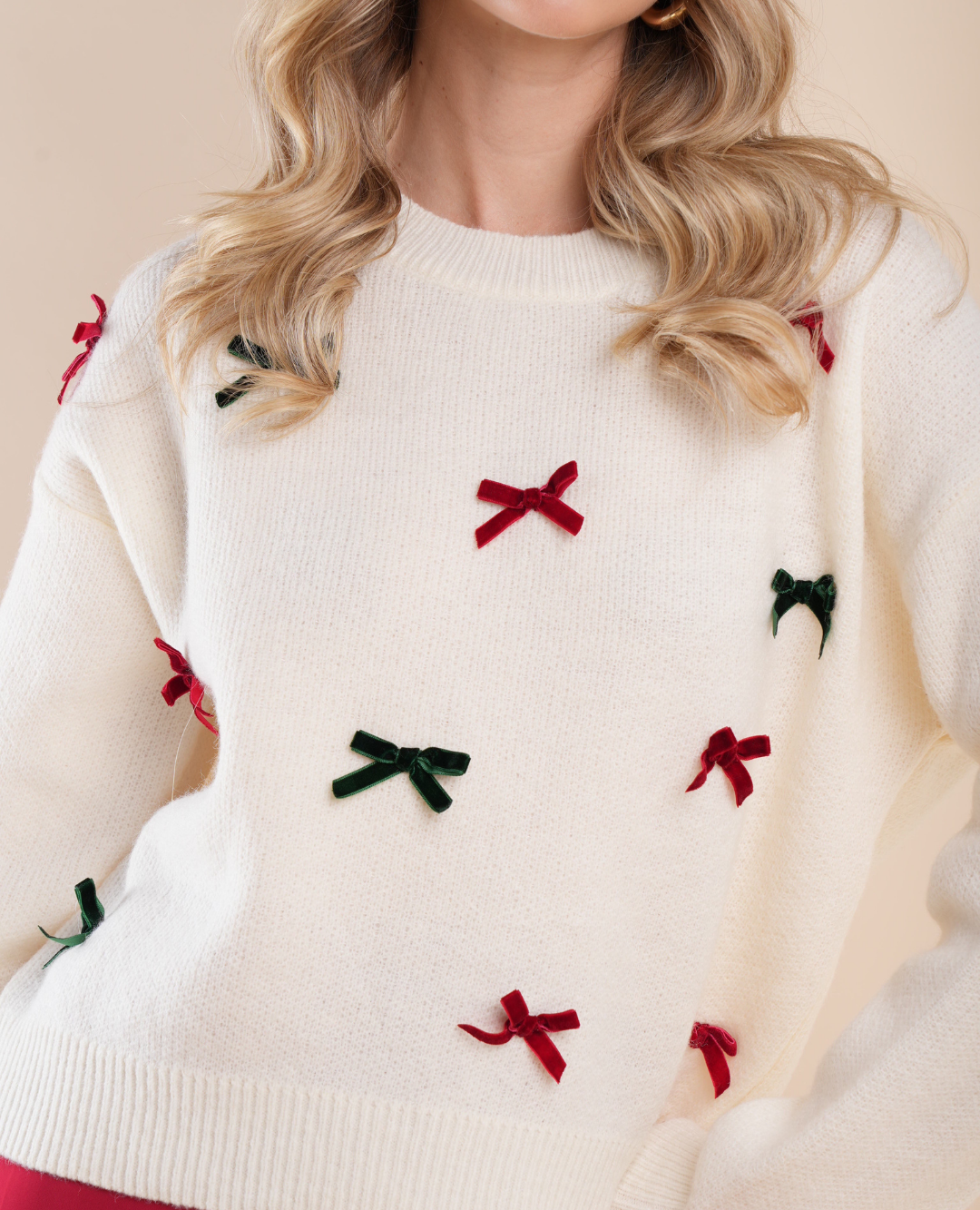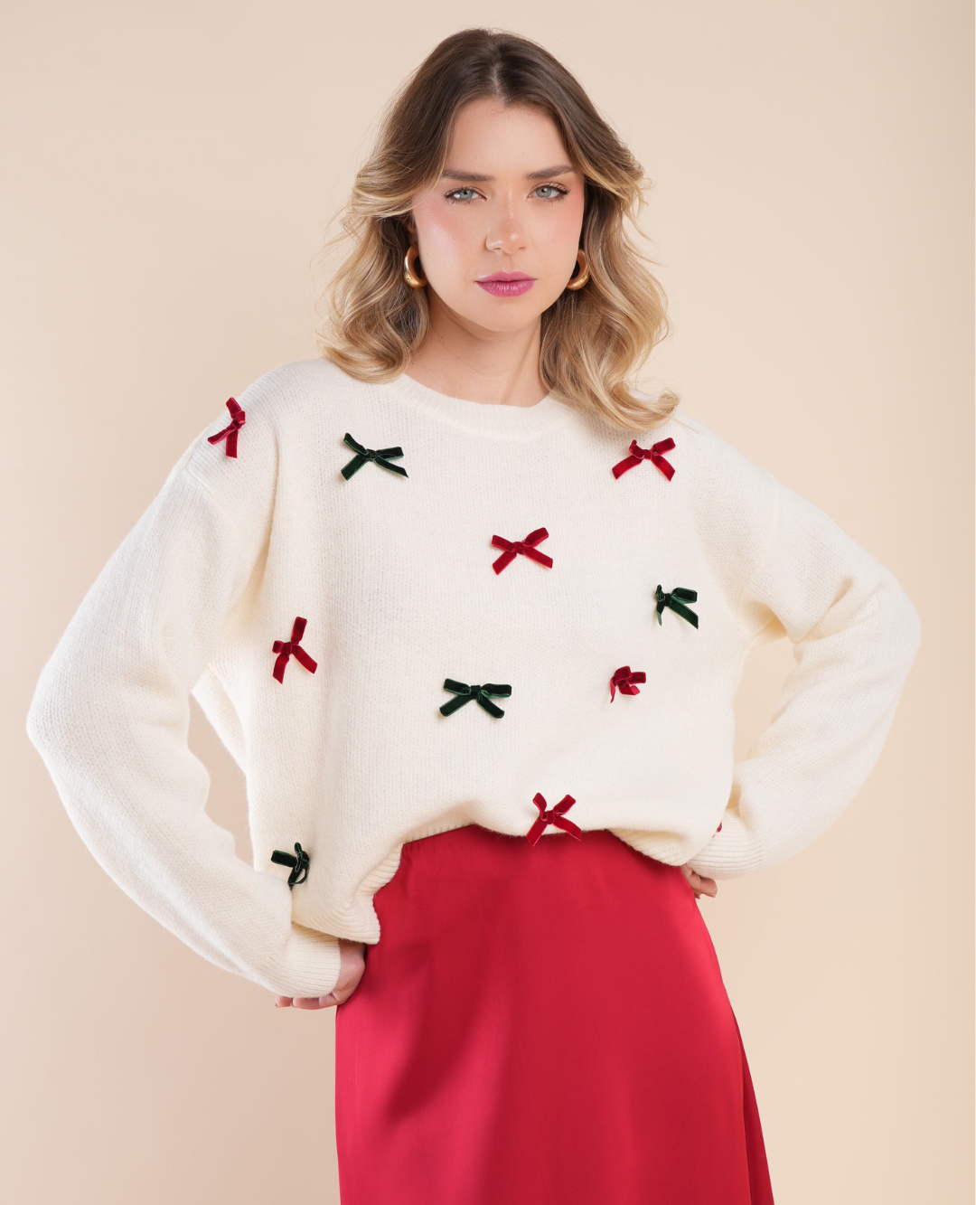 Festivo, encantador y lleno de espíritu navideño. Este saco tejido destaca por sus apliques de moños en tonos rojos y verdes, que aportan un toque alegre y sofisticado a la vez. Su diseño cálido y cómodo lo convierte en la prenda ideal para celebrar con estilo durante la temporada más mágica del año. Perfecto para combinar con jeans o faldas, y crear outfits llenos de encanto navideño. ✨🎁
