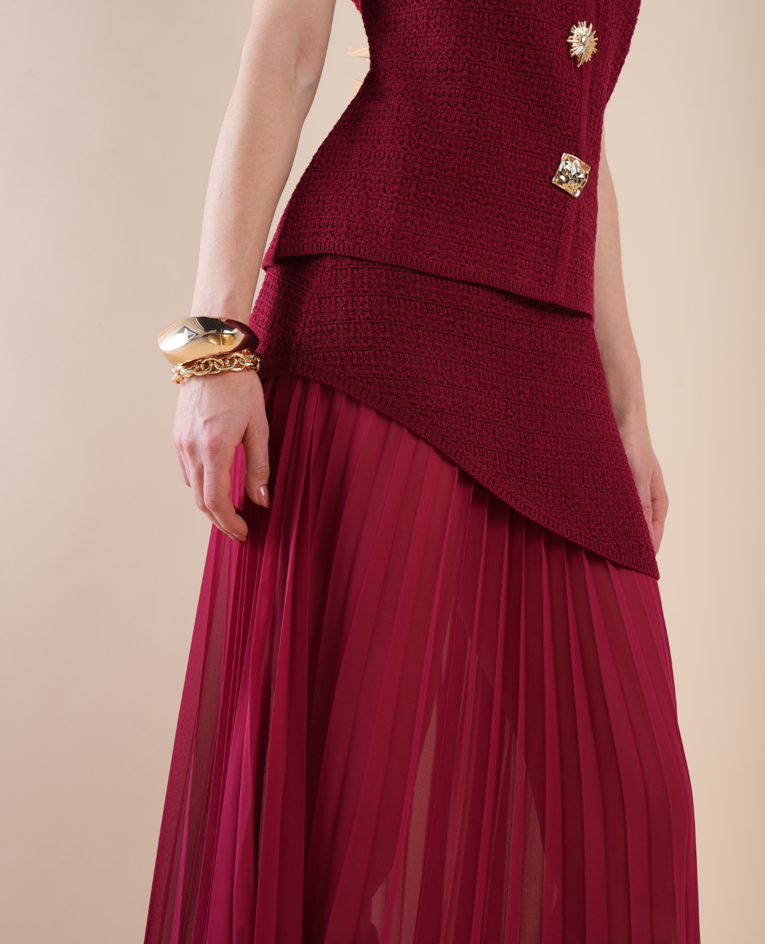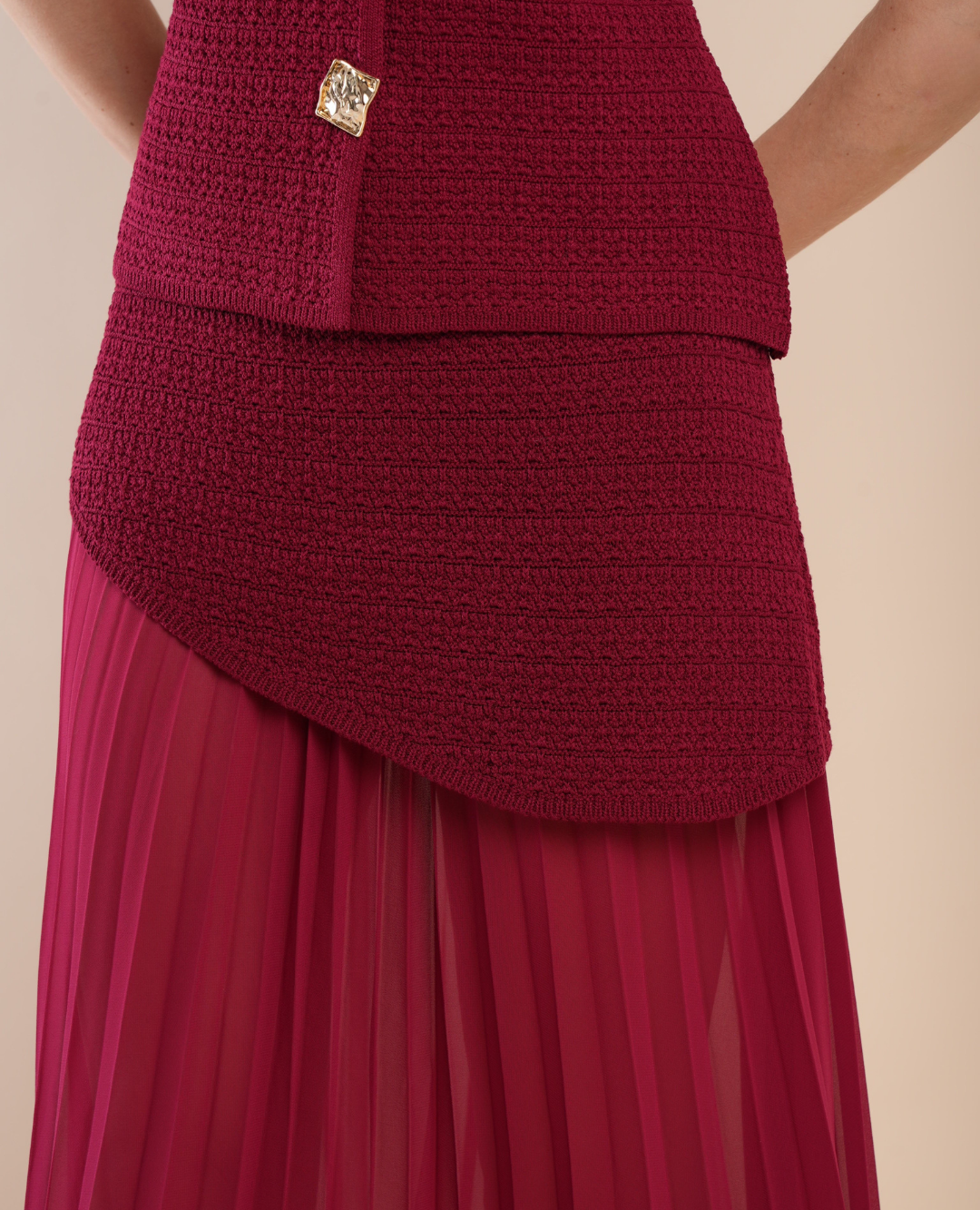 Elegancia y calidez en perfecta armonía. Este set en tono borgoña combina un chaleco tejido de textura suave y ajuste delicado con una falda plisada fluida, creando un look femenino, moderno y sofisticado. El color borgoña aporta un aire otoñal y chic, ideal para destacar con estilo en cualquier ocasión. Combínalo con botas altas o tacones y complementos dorados para un outfit que exhala distinción y encanto. 💫👠