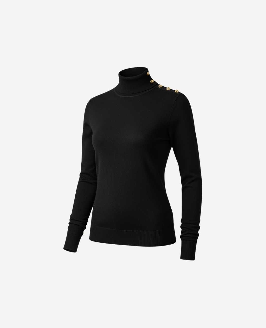 Este básico de cuello tortuga en color negro está confeccionado en tejido suave y cómodo, con un calce ajustado que estiliza la figura. Incluye botones decorativos en el hombro, un detalle sutil pero elegante que eleva cualquier look.
