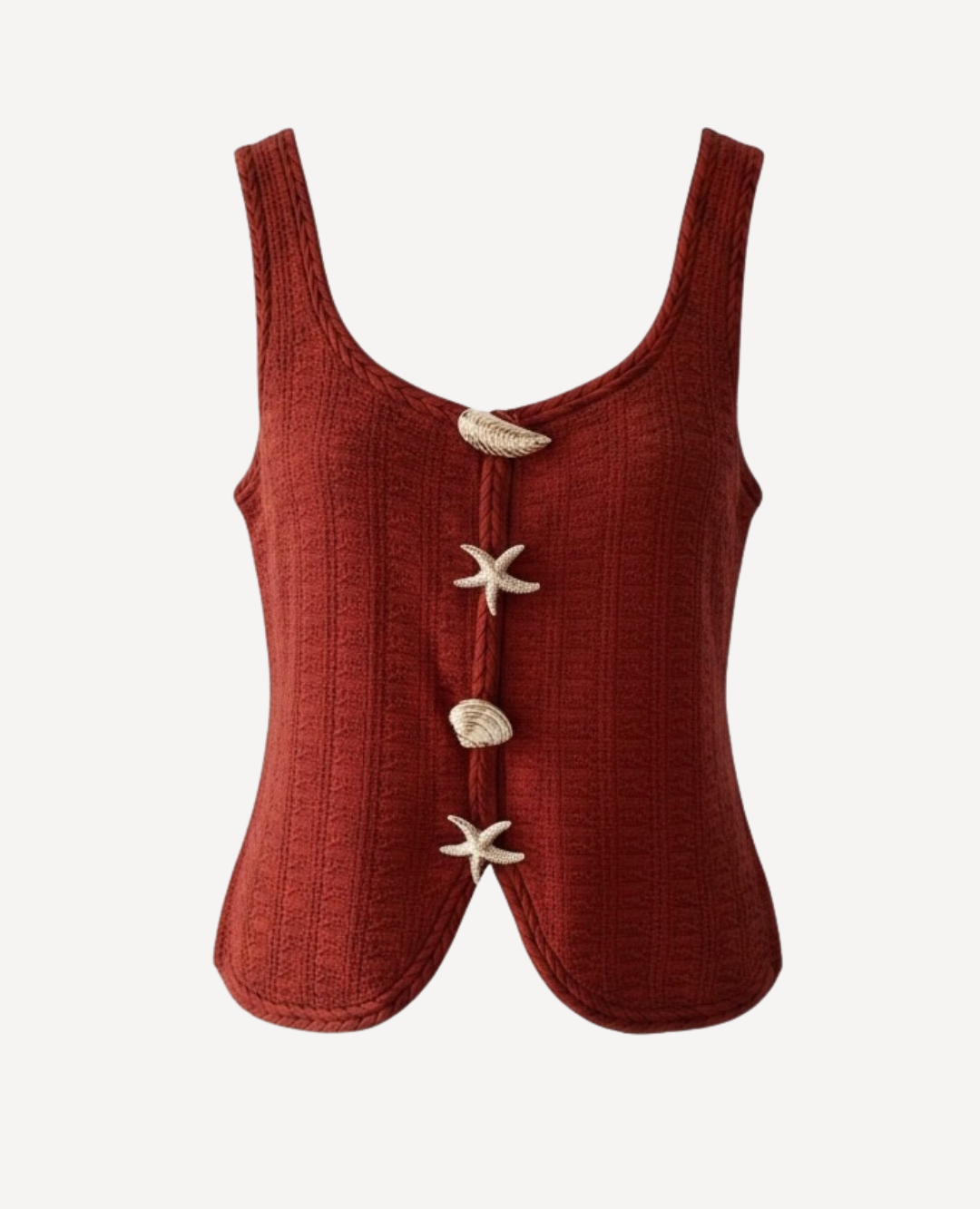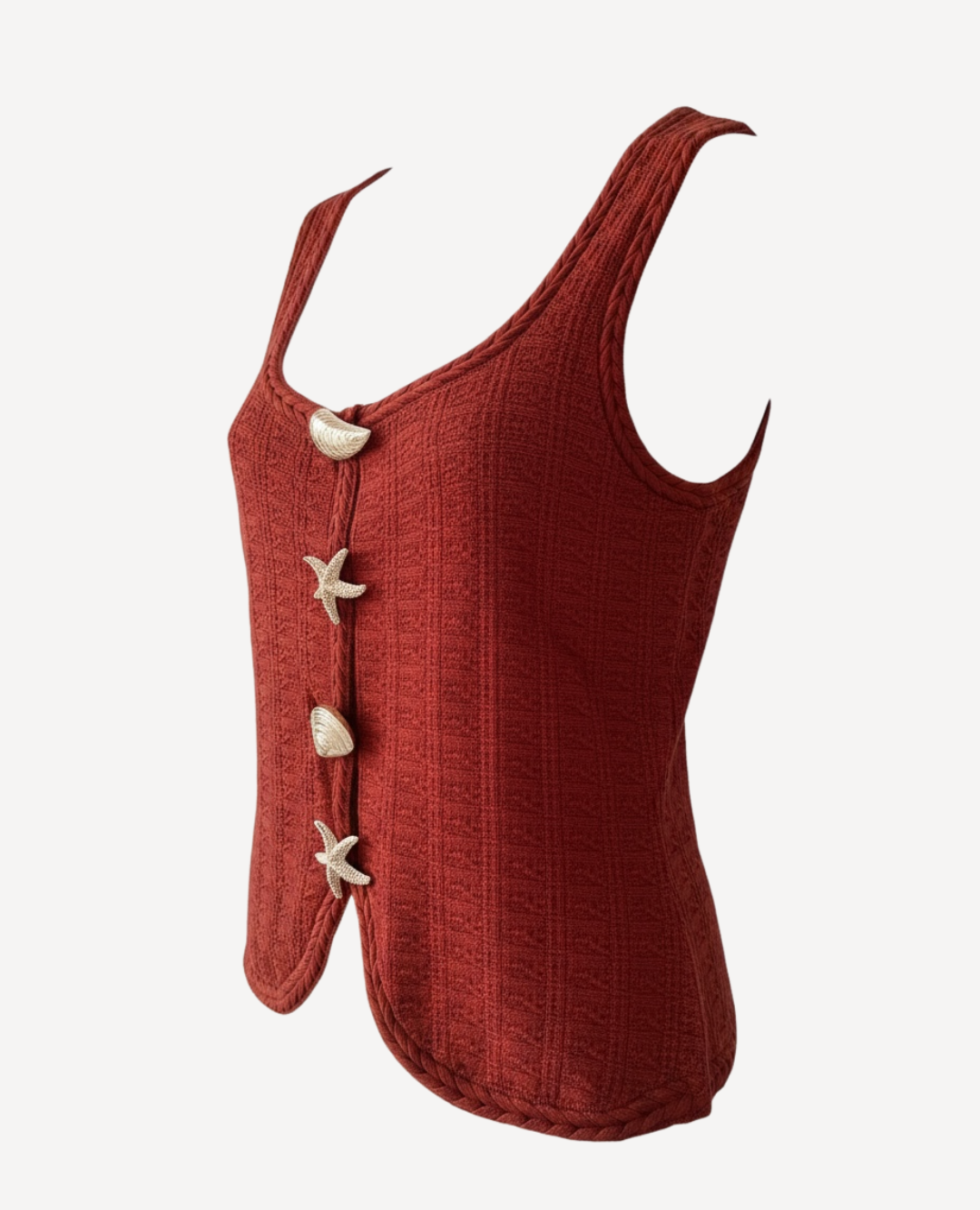 Un toque artesanal con mucho estilo 😍. Este chaleco tejido en tono terracota destaca por sus botones dorados inspirados en el mar, que le dan un aire elegante y único. Su corte entallado realza la figura y su diseño versátil lo convierte en la prenda ideal para combinar con jeans o faldas y crear looks llenos de encanto.