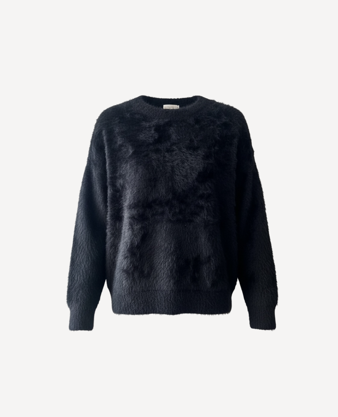 Un básico de invierno con un toque chic irresistible. Este saco negro de cuello redondo destaca por su textura peluda y suave, que le da un aire sofisticado y moderno sin perder calidez. Su diseño minimalista lo convierte en una prenda súper versátil, perfecta para elevar cualquier outfit con elegancia sutil.