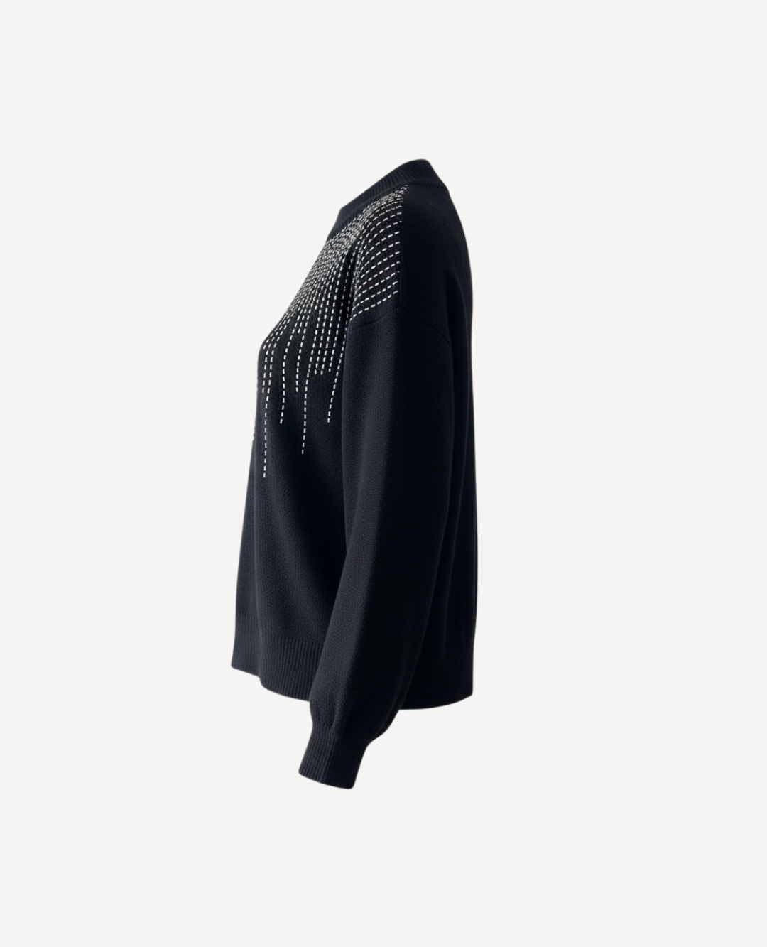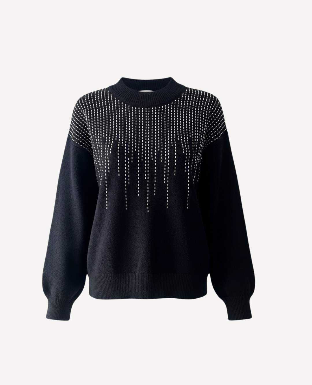 Un suéter que habla por sí solo: moderno, brillante y perfecto para looks que quieren destacar. Este saco negro deslumbra con un diseño de brillantes tipo “lluvia”, que caen de manera elegante desde el escote hacia el pecho, creando un efecto visual sofisticado y súper chic.