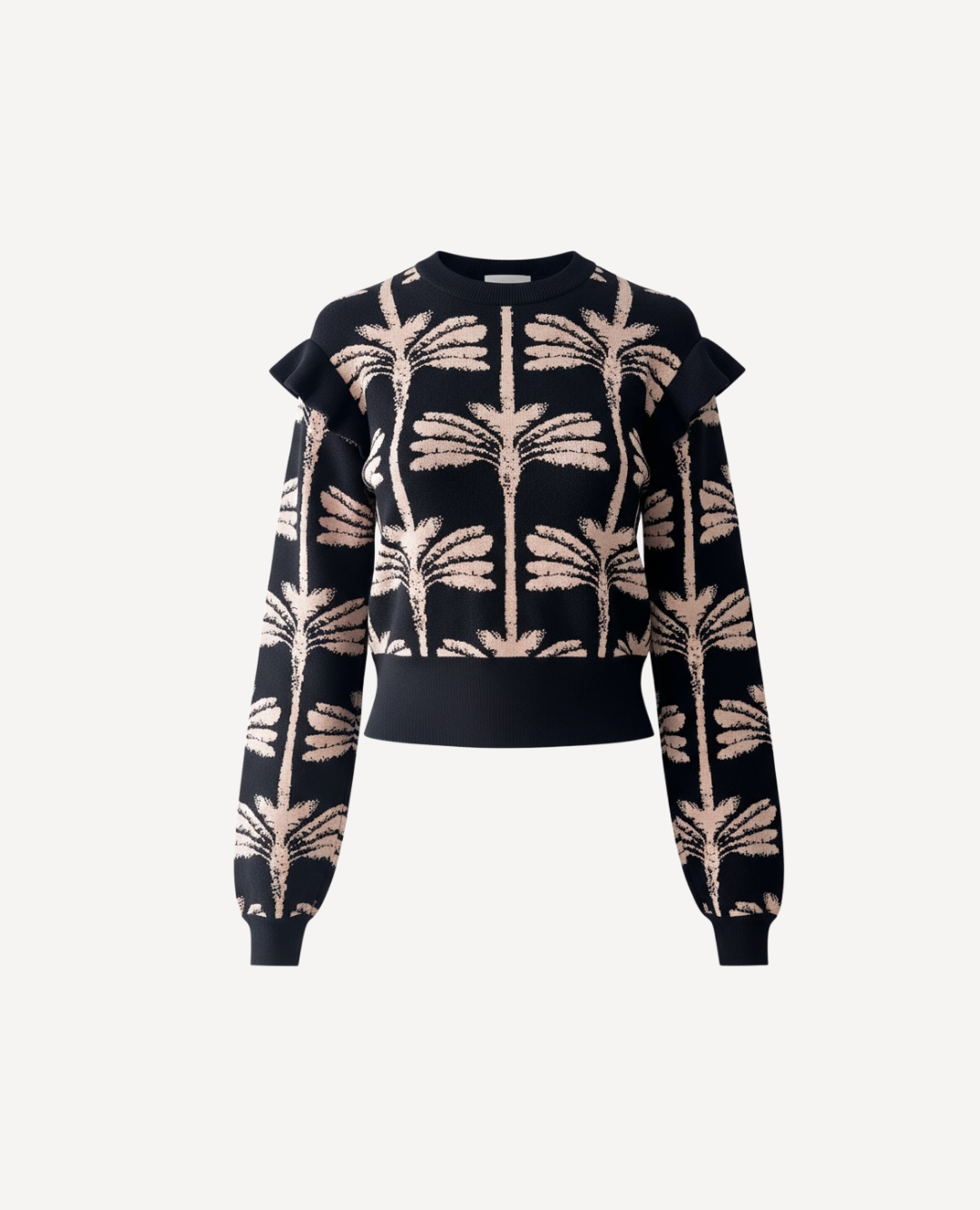Un diseño que combina estilo tropical con la suavidad del tejido. Este saco tejido con palmeras destaca por su textura acogedora y su patrón moderno que aporta un toque único y sofisticado a cualquier look.