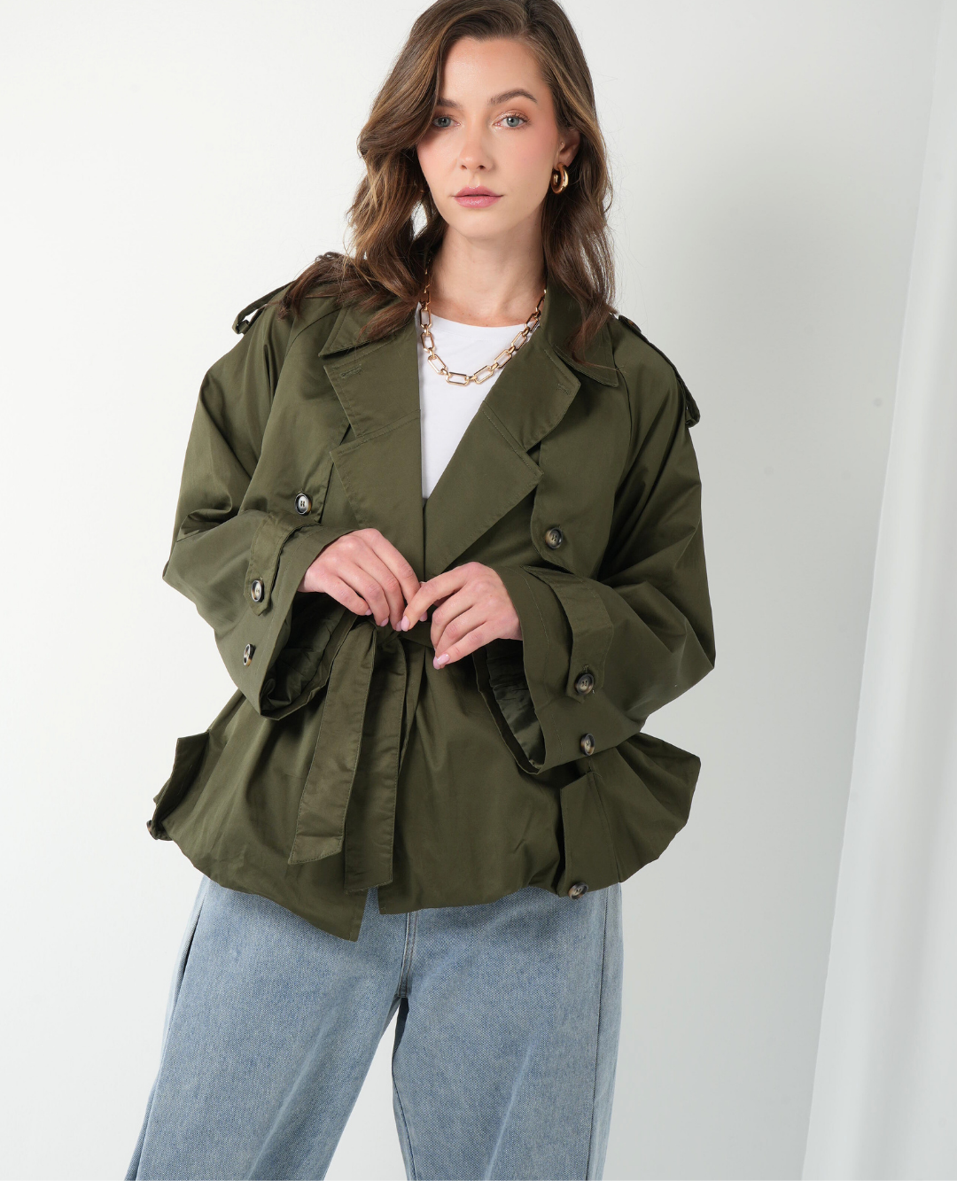 Una prenda moderna y sofisticada. Esta gabardina estilo globo en color verde destaca por su silueta voluminosa y ligera, que aporta movimiento y un aire contemporáneo a cualquier look. Su diseño es perfecto para crear capas sin perder comodidad ni estilo.